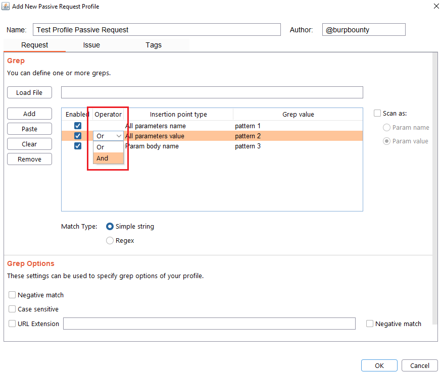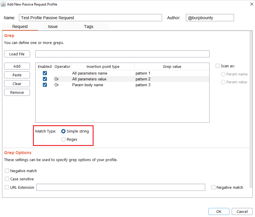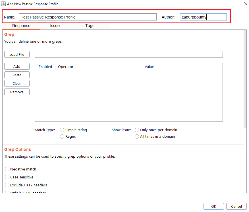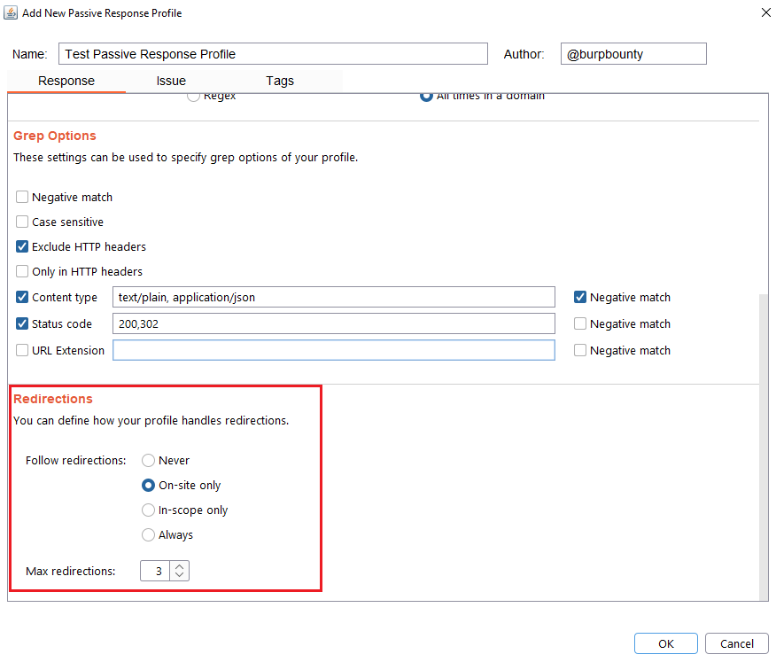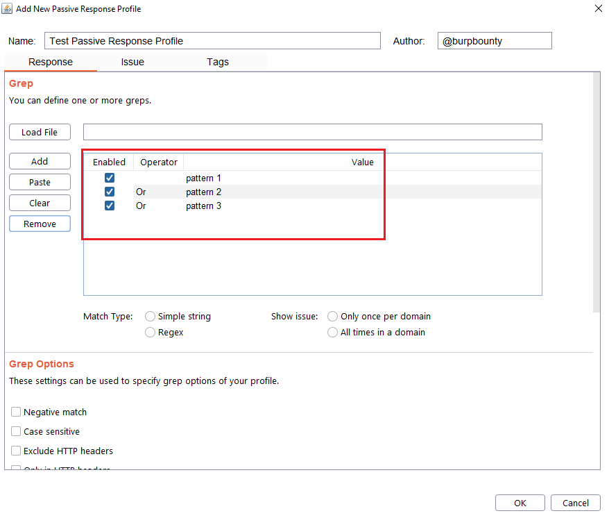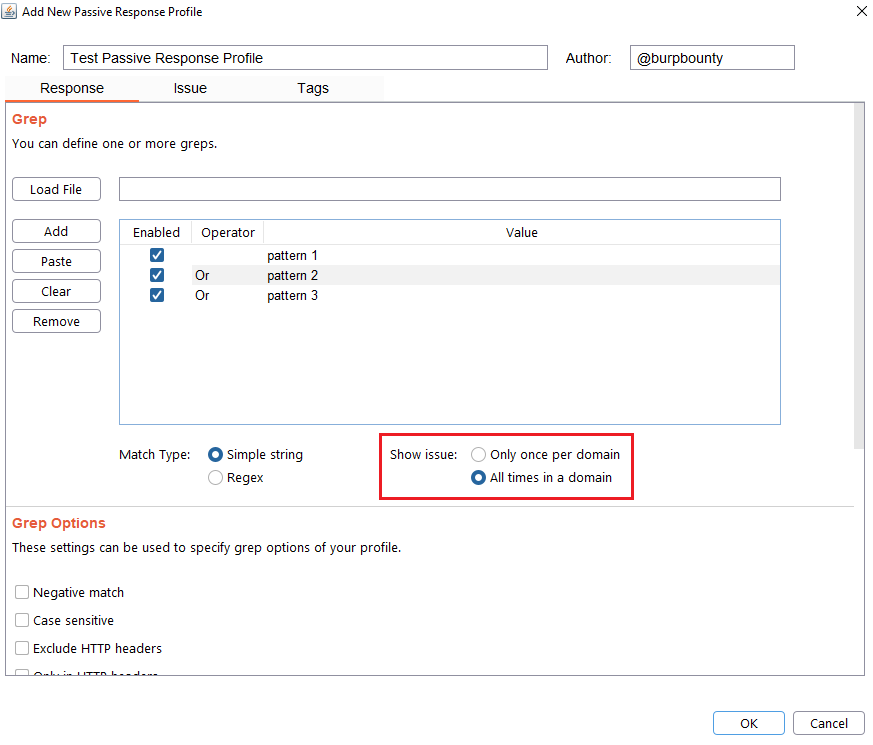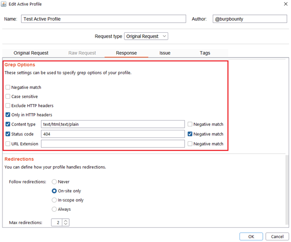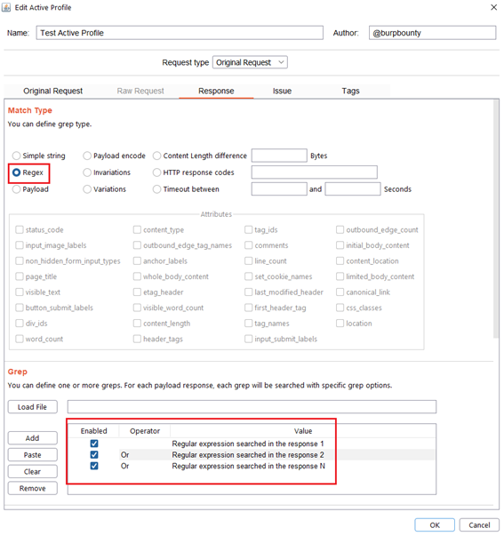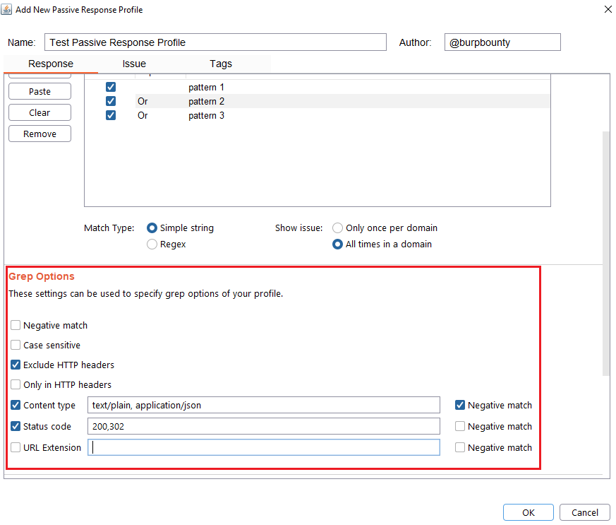 Step 6 (Optional)- Response->Grep Options: In this section you can specify more options to create more accurate profiles and obtain fewer false positives. This options only are disponible for the Match types: