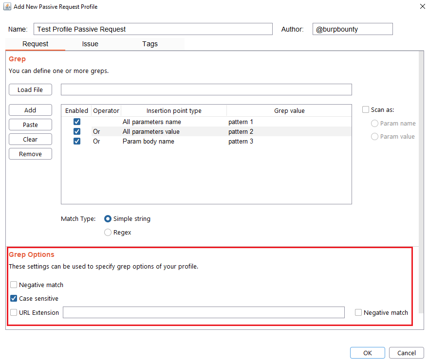 URL Extension: It will only search for patterns if the extension of the URL to which the request is made, matches the extension or extensions specified in this field (for example, php or jsp, etc) or if it doesn’t match (negative match checkbox)