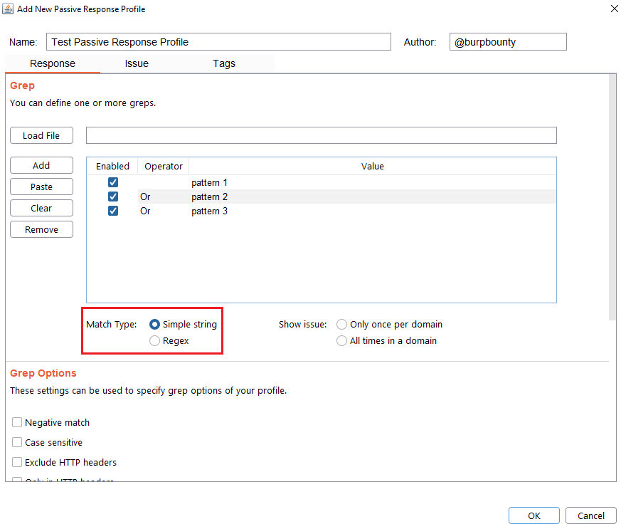 Content type: The pattern will only be searched in the HTTP response if the content type of the HTTP response is equal to the “content type” field. You can specify multiple content types separated by commas. You can also specify that ONLY look for the pattern in the HTTP response if the content type is NOT equal to this field, marking the “negative match” checkbox.
