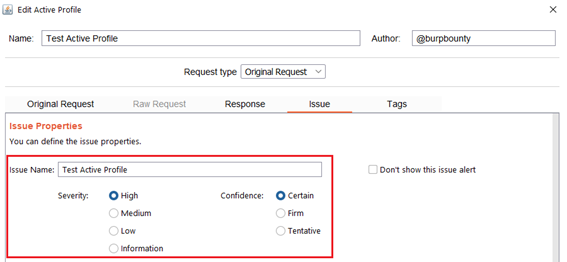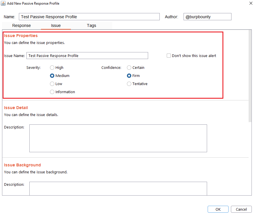 It’s necessary for the issue to appear, give it a “Issue Name” and complete the two fields, both the “severity” and the “confidence”. The issue descriptions are optional.