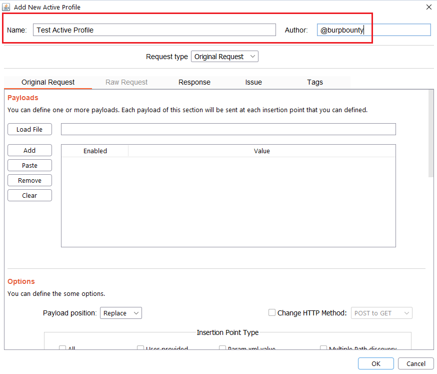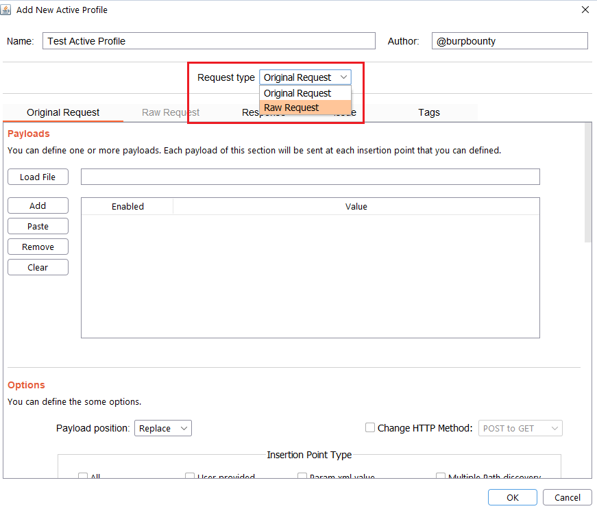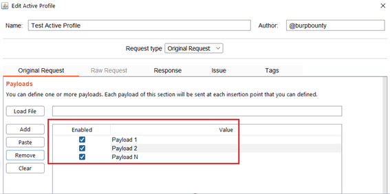 Step 2.1 (Required)- Original Request -> Payloads: It sets the payload or payloads that will be sent in the selected request insertion points.