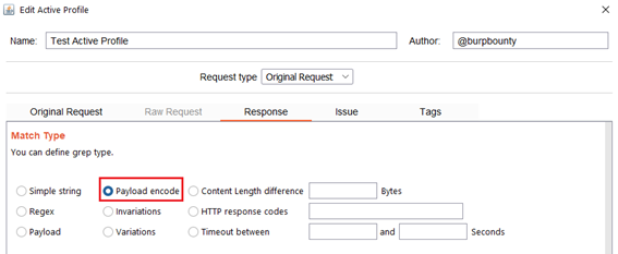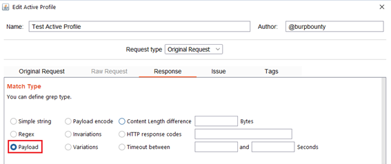 Payload: Search for a Payload (that have been specified in the Original Request->Payloads section) in the HTTP response.