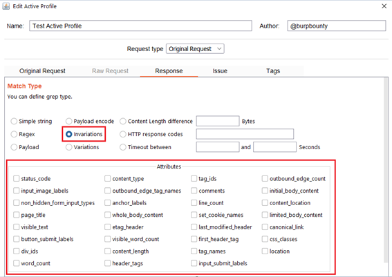 Invariations: This option looks for the NO difference in the attributes marked in the “Attributes” section between the response of the original HTTP request and the responses of the HTTP requests modified with the payloads.