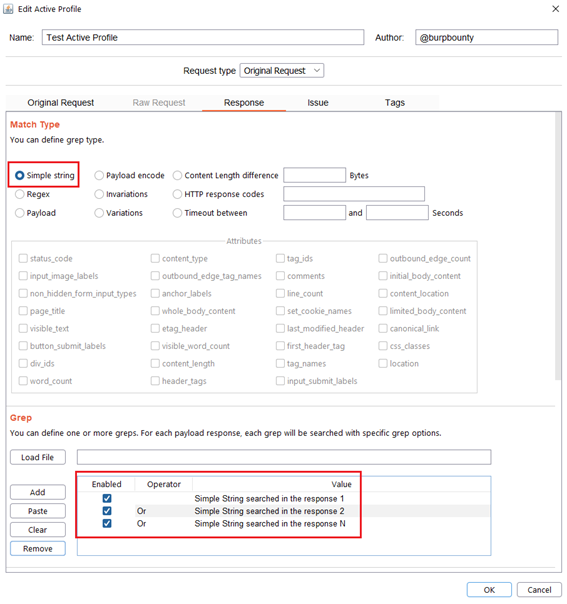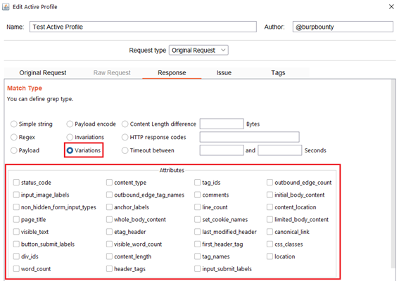 Variations: This option looks for the difference in the attributes marked in the “Attributes” section between the response of the original HTTP request and the responses of the requests modified with the payloads.