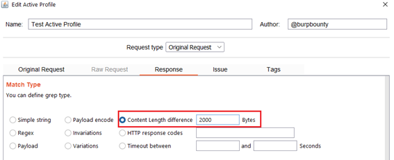 Content length difference: This option finds the difference between the content length (in bytes) of the response of the original HTTP request and the responses of the requests modified with the payloads.