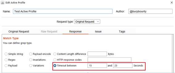 Timeout between: This option searches in the HTTP responses for a time delay in seconds in a range that can be specified. The following example looks for a HTTP response to take between 15 seconds and 25 seconds to respond.